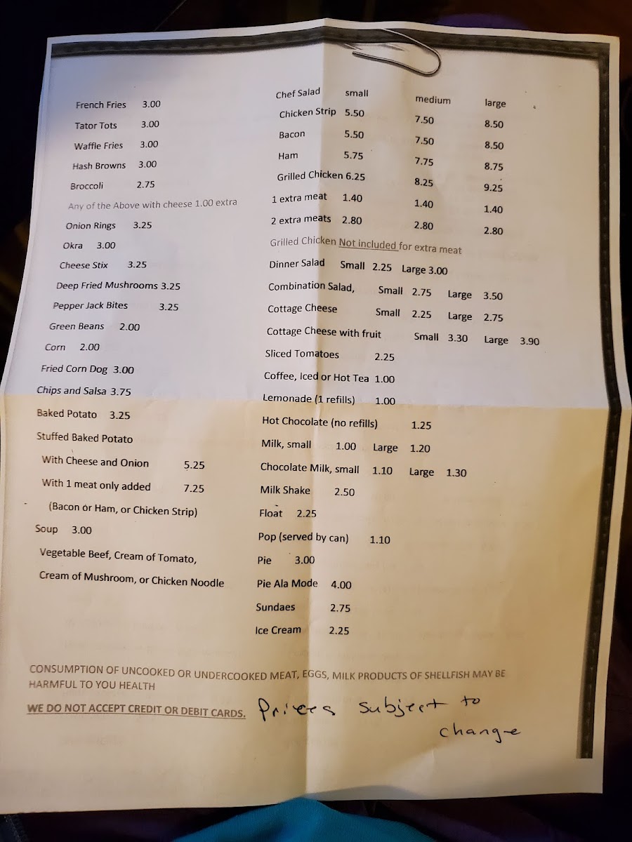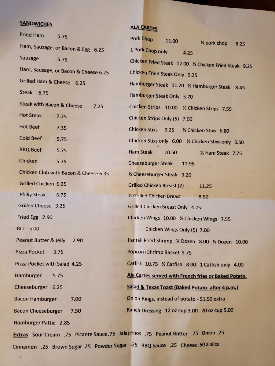 If you're in the mood for some classic Southern flair, you can't go wrong with the Pork Chops priced at $9.00 or the Bacon Cheese Hamlet for $9.25, both promising a savory flavor explosion that lingers on your taste buds. For lighter fare, the Chef Salad at $7.75 offers a refreshing respite, loaded with fresh ingredients. Don’t miss out on the homemade pie—as noted by satisfied customers, it’s a sweet ending that should not be overlooked.